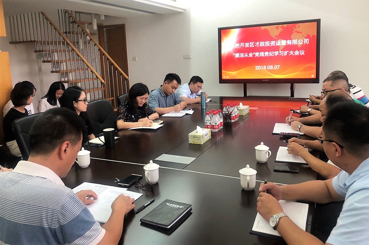2018年8月7日下午,廣州開發區人才工作集團副總經理李澤洪同志主持召開分管部門和二級公司“廉潔從業”黨規黨紀學習擴大會議。資產運營部、才政公司、才力公司全體黨員干部及職工參加了會議。這是國有企業深入貫徹落實習近平總書記黨建思想,全面提升新時代基層黨建工作質量的常態化舉措。