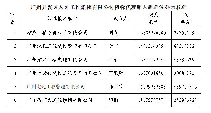 廣州開發區人才工作集團有限公司招標代理庫組建工作通過公開征集、入庫審核等程序現已完成,現將入庫名單(詳見下表)予以公示,公示期為3天。組建的集團公司招標代理庫自公示結束后正式啟用。