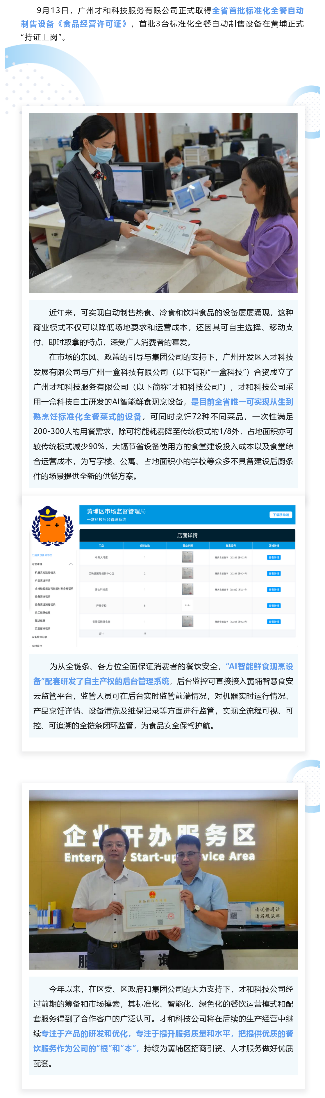 才和科技公司取得全省首批標準化全餐自動制售設備《食品經營許可證》